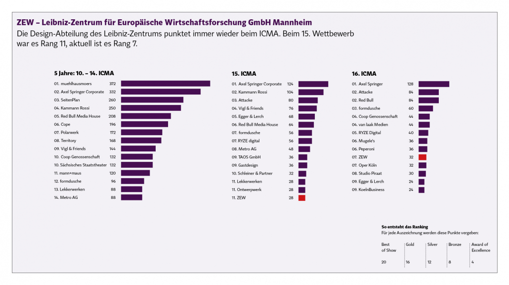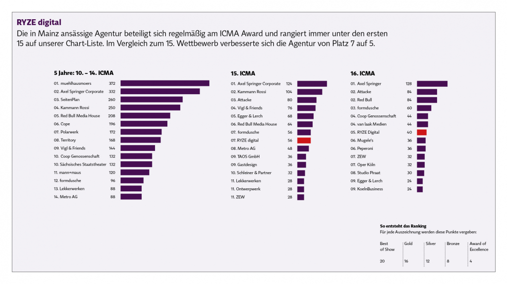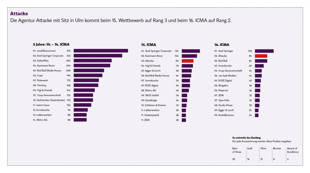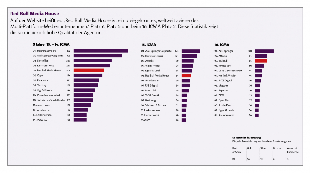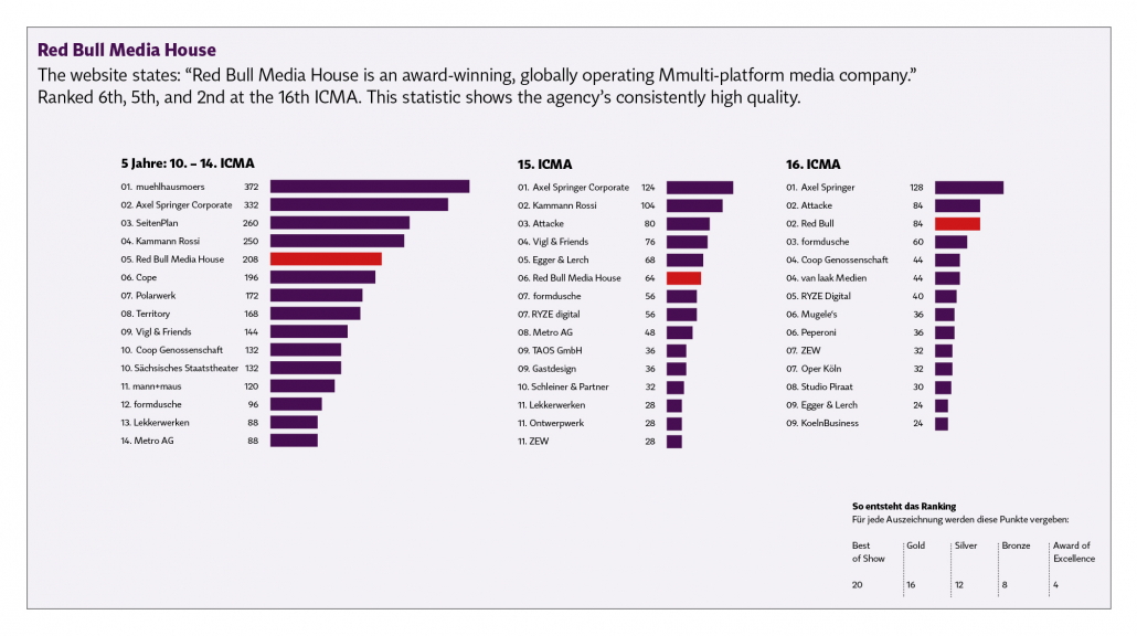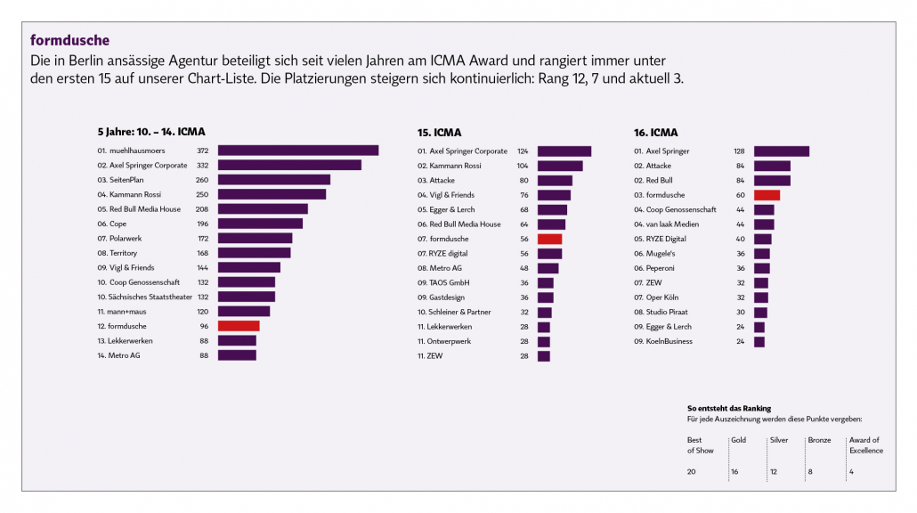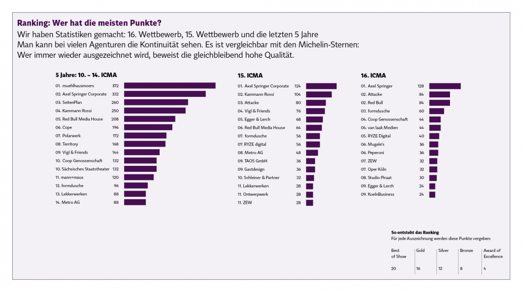 Wir haben Statistiken gemacht: 16. Wettbewerb, 15. Wettbewerb und die letzten 5 Jahre. Man kann bei vielen Agenturen die Kontinuität sehen. Es ist vergleichbar mit den Michelin-Sternen: Wer immer wieder ausgezeichnet wird, beweist die gleichbleibend hohe Qualität.