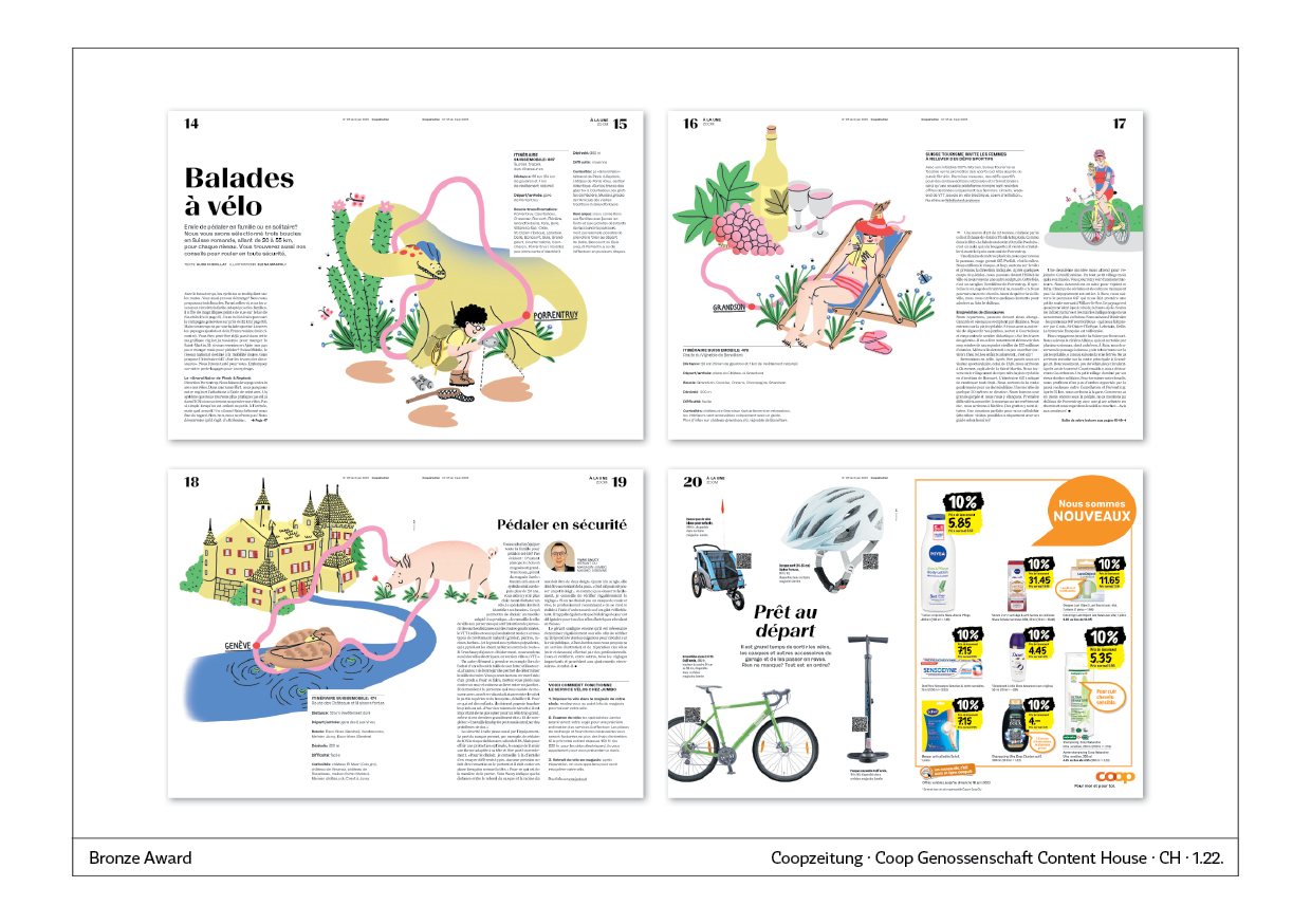 Thema der Coverstory ist die Schweiz auf dem Fahrrad. Die Redaktion hat drei Routen zusammengestellt, für Familien oder Einzel-Radler. Die Visualisierung auf der Titelseite ist gut, zum Innern ist ein gewisser Bruch sichtbar, denn da werden fast ausschließlich Illustrationen eingesetzt.