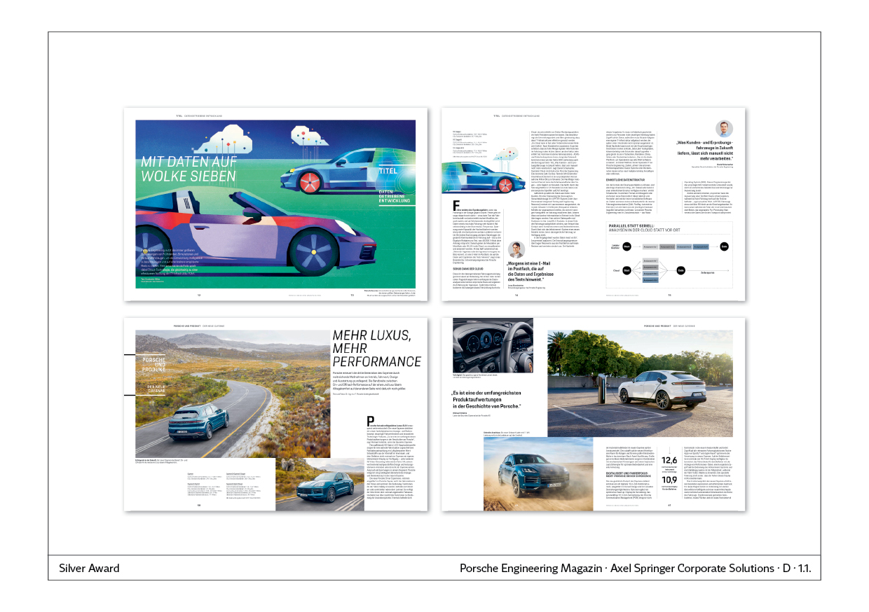 Typografie: Durch den Font „Porsche Next TT“ wird eine unverwechselbare Schrift eingesetzt, die besonders in Headlines und im Cover-Schriftzug gut zur Wirkung kommt. Sie wirkt technisch, kühl, aber durch typografische Details, wie beim „r“ sehr modern und passend zum innovativen Image von Porsche.