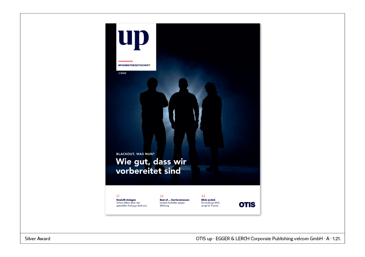 Das Mitarbeitermagazin „up” von Otis Österreich verbindet Information und Emotion, um die Belegschaft des Unternehmens zu informieren und zu inspirieren. Es richtet sich an rund 500 Mitarbeitende von Otis in Österreich und zeichnet sich durch seine hochwertige Aufmachung, authentische Geschichten und eine klare visuelle Sprache aus. „up” erscheint ein- bis zweimal jährlich und vermittelt wichtige Unternehmensinformationen ebenso wie die Erfolge und Geschichten der Mitarbeitenden.