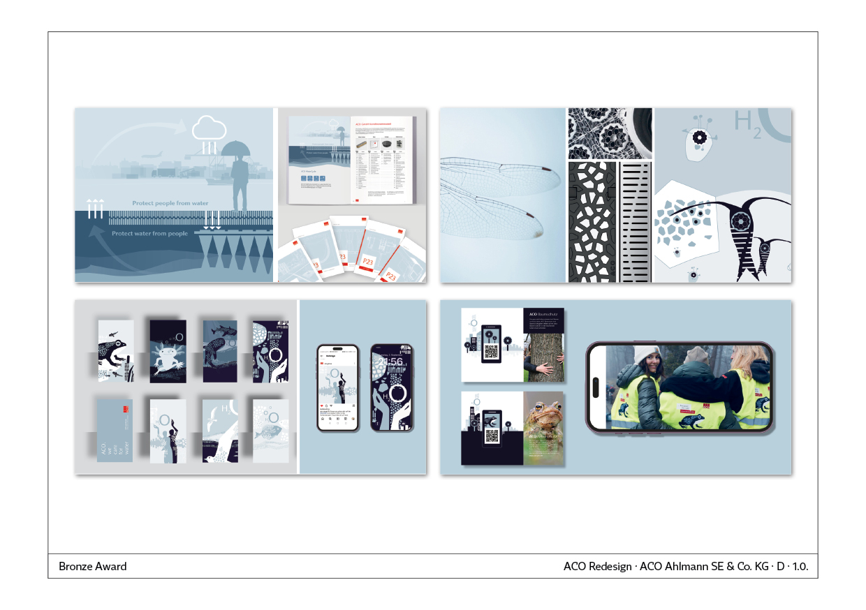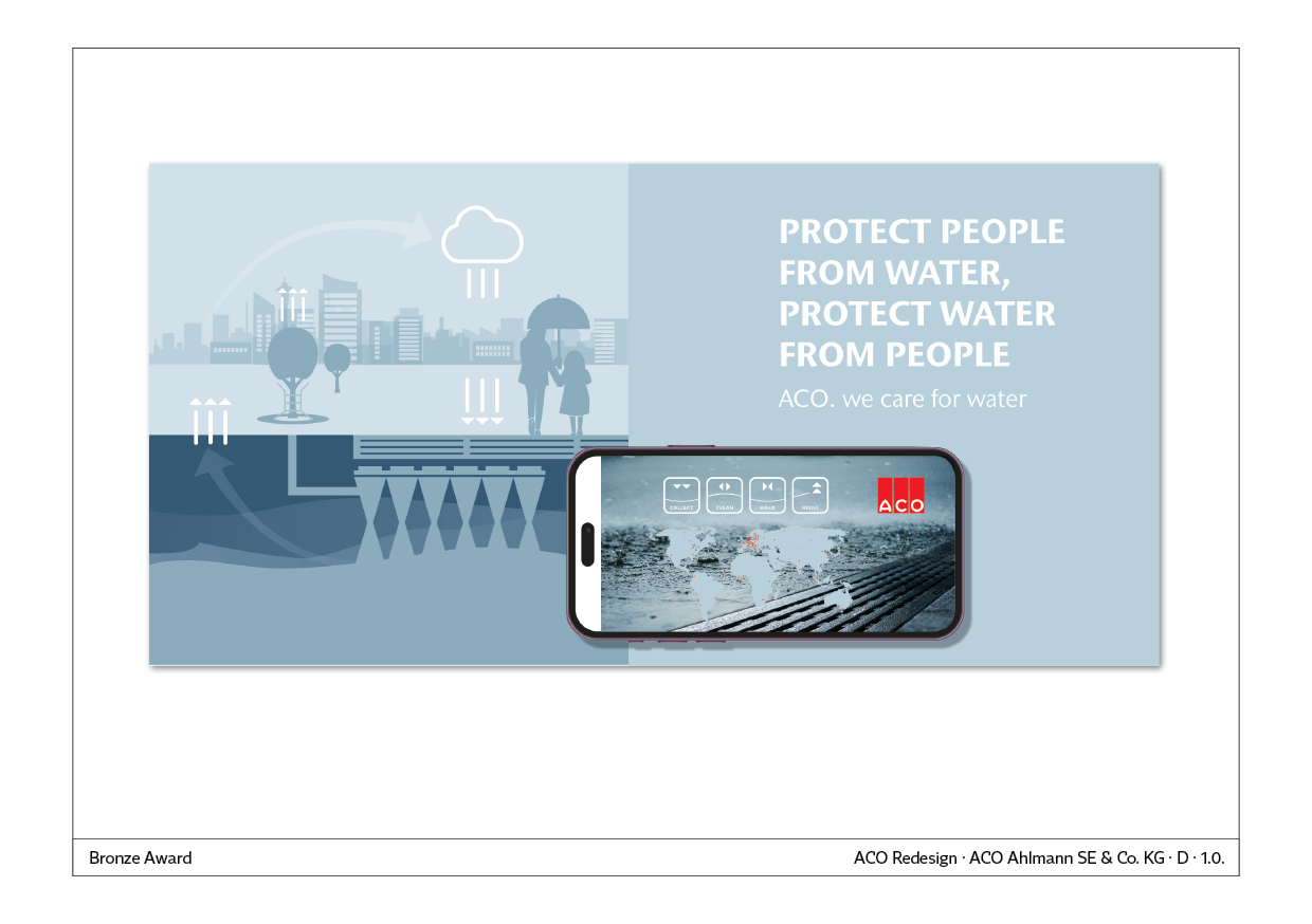 Das Redesign zielt darauf ab, eine nahbare und emotionale Bildsprache mit hoher Identifikationsbereitschaft zu schaffen. Die Hauptaussage “Protect people from water, protect water from people” wird durch Keyvisuals, z.B. einer Mitarbeiterin mit umgedrehtem Regenschirm, und Tierbildwelten vermittelt. ACO PRO, als Beispiel, schützt Lebensräume von Amphibien.