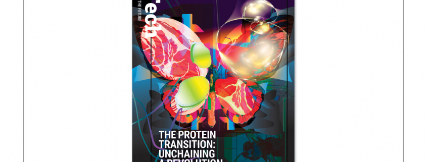 In terms of content, this issue is about research into meat substitutes. That is why a butterfly is combined with pieces of meat on the cover. The headline reads: Protein Transition: Unchaining a revolution. A good combination of text and image that arouses curiosity about the inside.
