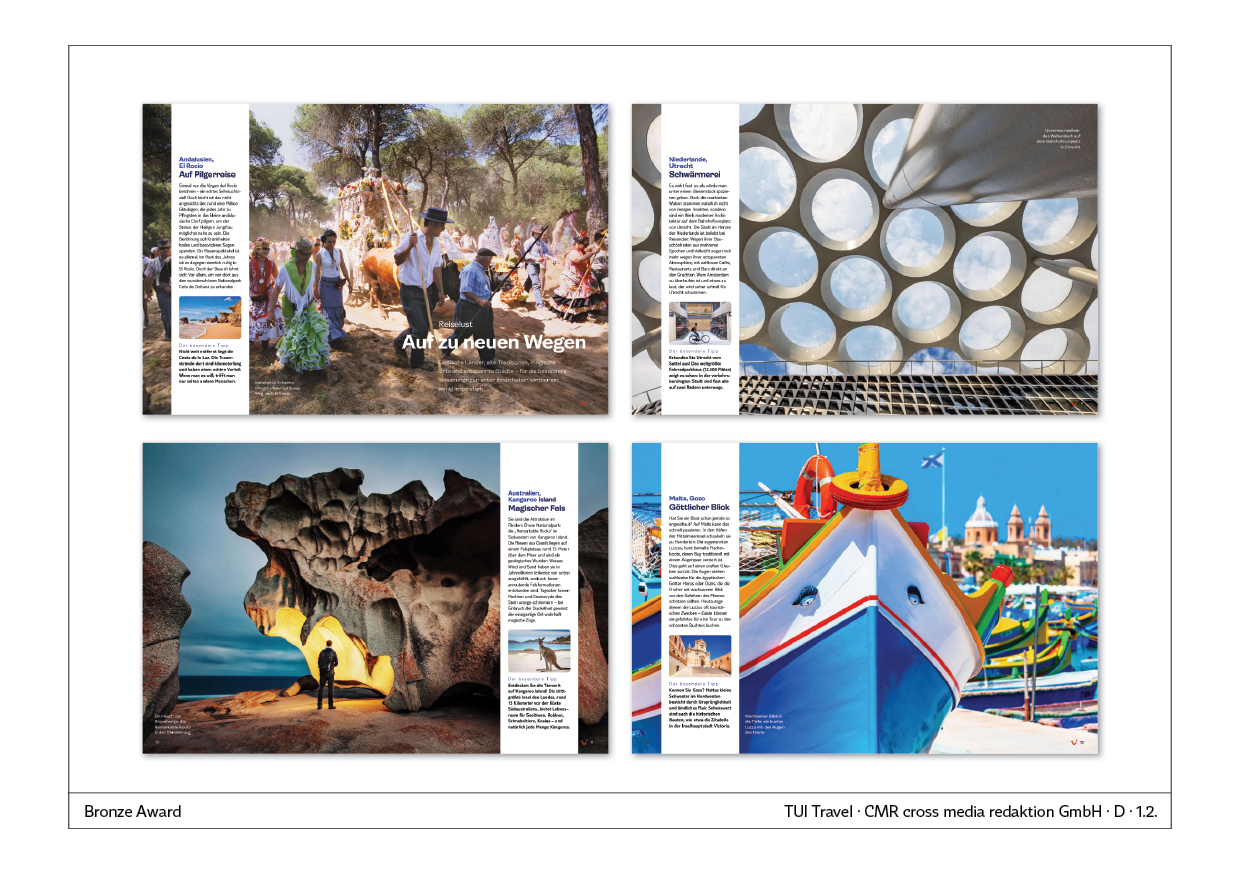 TUI Travel ist aufgebaut wie Publikums-Reisemagazine. Wir beginnen mit einer Fotostrecke, bringen dann packende Reisereportagen aus aller Welt, berichten aber auch über Hintergründe und Fakten, z.B. zum Thema nachhaltiges Reisen.