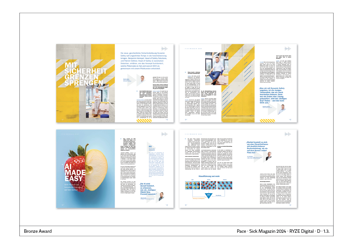 Für 2024 wurde das Thema „Pace“ gewählt, um die beschleunigte Lösungsfindung in einem dynamischen Markt zu reflektieren. Die Herausforderung besteht darin, den Technologiekonzern Sick in einem Magazin spannend und verständlich darzustellen. Der Storytelling-Ansatz im Magazin zielt darauf ab, technologische Geschichten emotional und menschlich zu präsentieren.