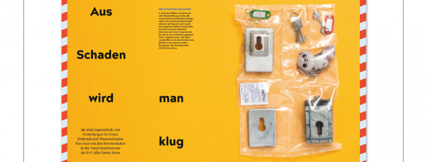 Auf drei Doppelseiten werden kleine Gegenstände ausgebreitet, die für teilweise hohe Versicherungsschäden stehen. Die Farbe Gelb und die rot-weißen Absperrbänder symbolisieren die Absperrungen an Unglücksstellen. Gleichzeitig heben sie diesen Artikel aus den anderen hervor.